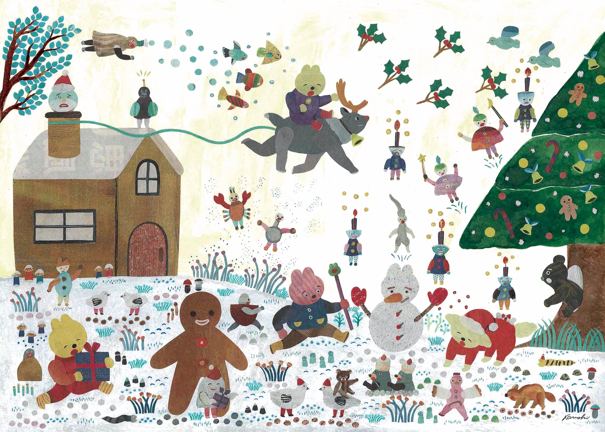 サンタさんのトナカイをプレゼントと間違えているウサギがいる。