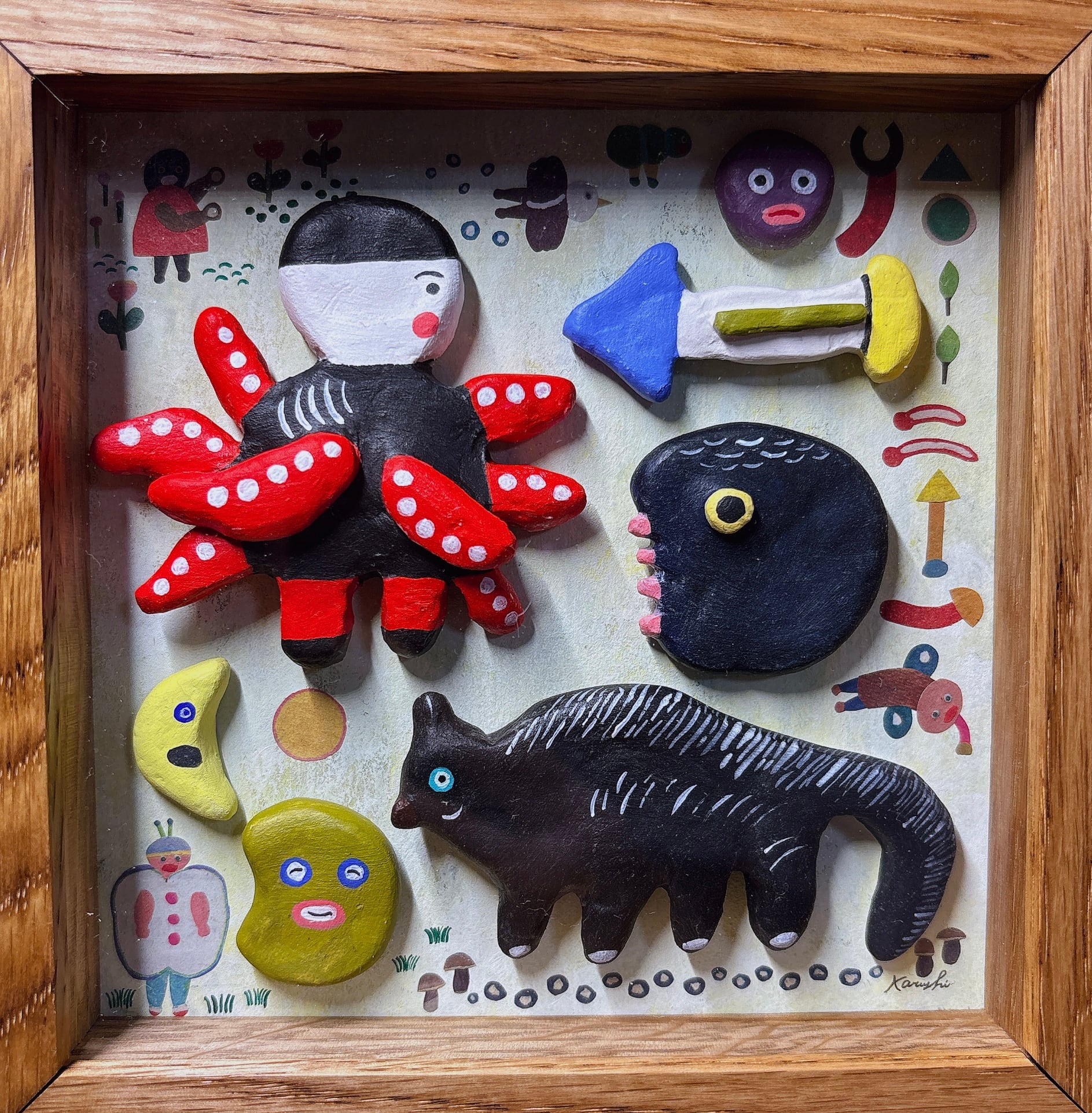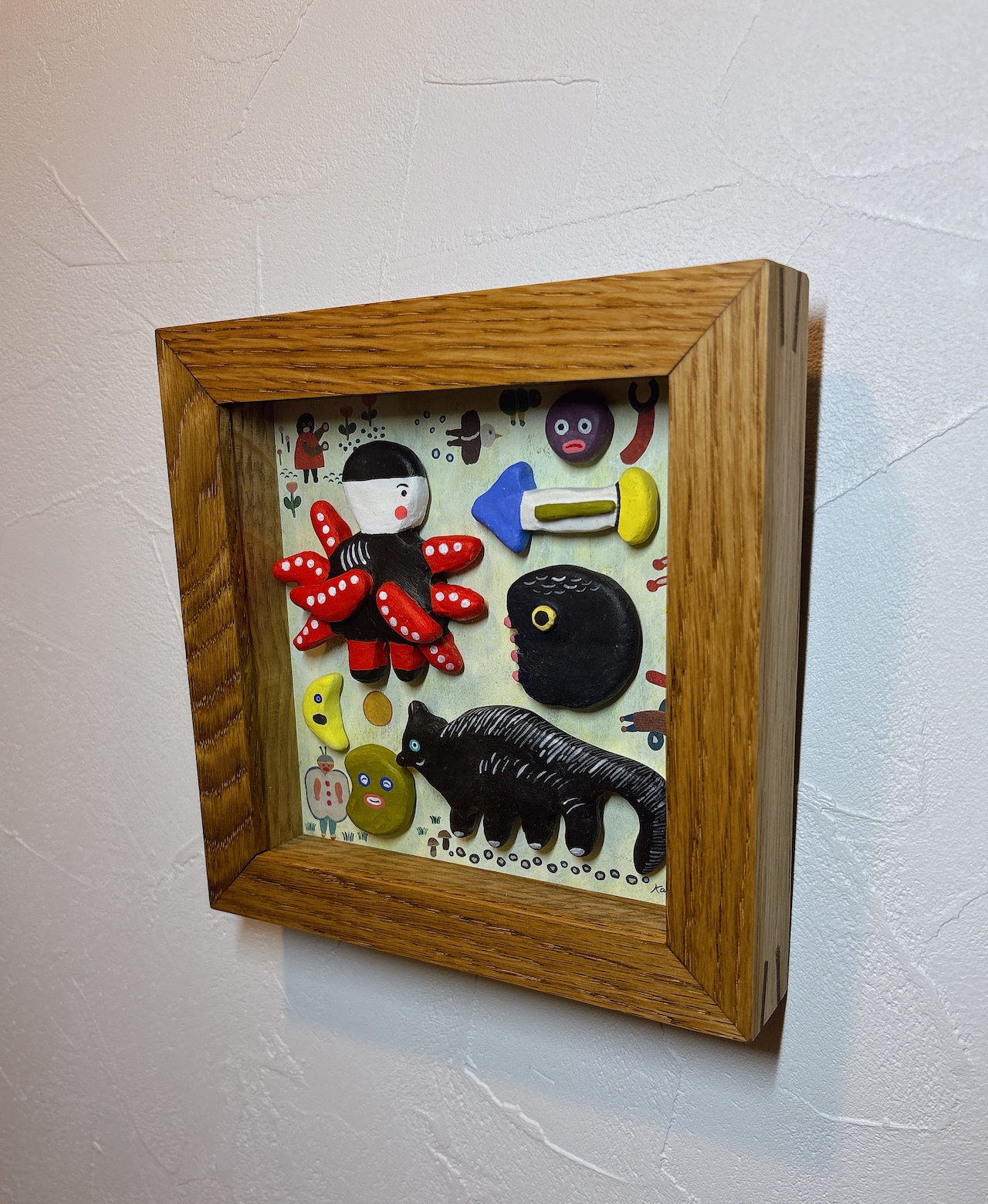 軽量石塑粘土を使用しタコ人間、ねこ(黒いスカンクみたいなの)パックン(右側の黒い丸)